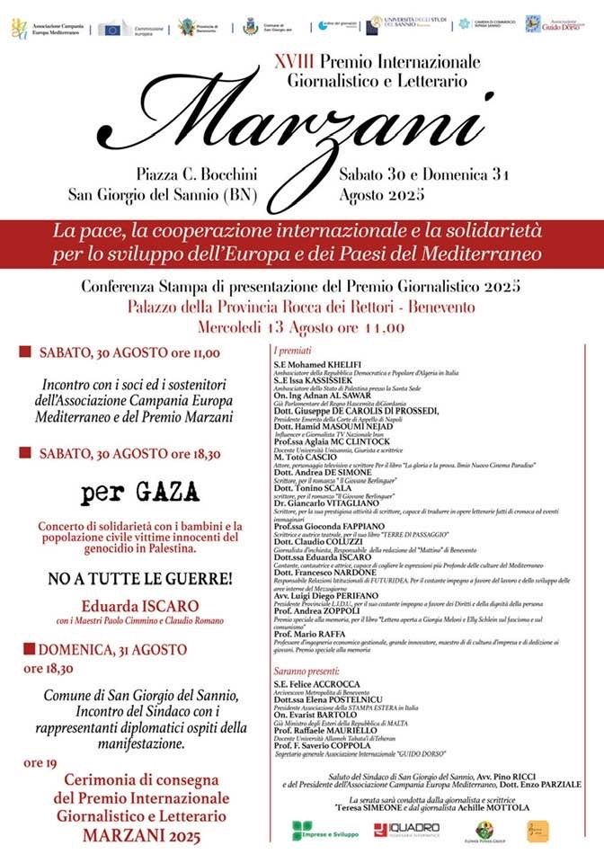 San Giorgio del Sannio ha ospitato, il 30 e 31 agosto, la diciottesima edizione del Premio Internazionale Giornalistico e Letterario “Marzani”, promosso dall’Associazione Campania Europa Mediterraneo presieduta da Enzo Parziale. Un appuntamento ormai consolidato che, anche quest’anno, ha confermato la sua vocazione: creare uno spazio di incontro dove cultura, giornalismo e impegno civile dialogano per dare voce ai grandi temi del nostro tempo. La conduzione delle due serate è stata affidata ai giornalisti Teresa Simeone e Achille Mottola, che hanno guidato il pubblico attraverso testimonianze, riflessioni e contributi di giornalisti, scrittori, diplomatici ed esponenti del mondo istituzionale e della cooperazione internazionale.